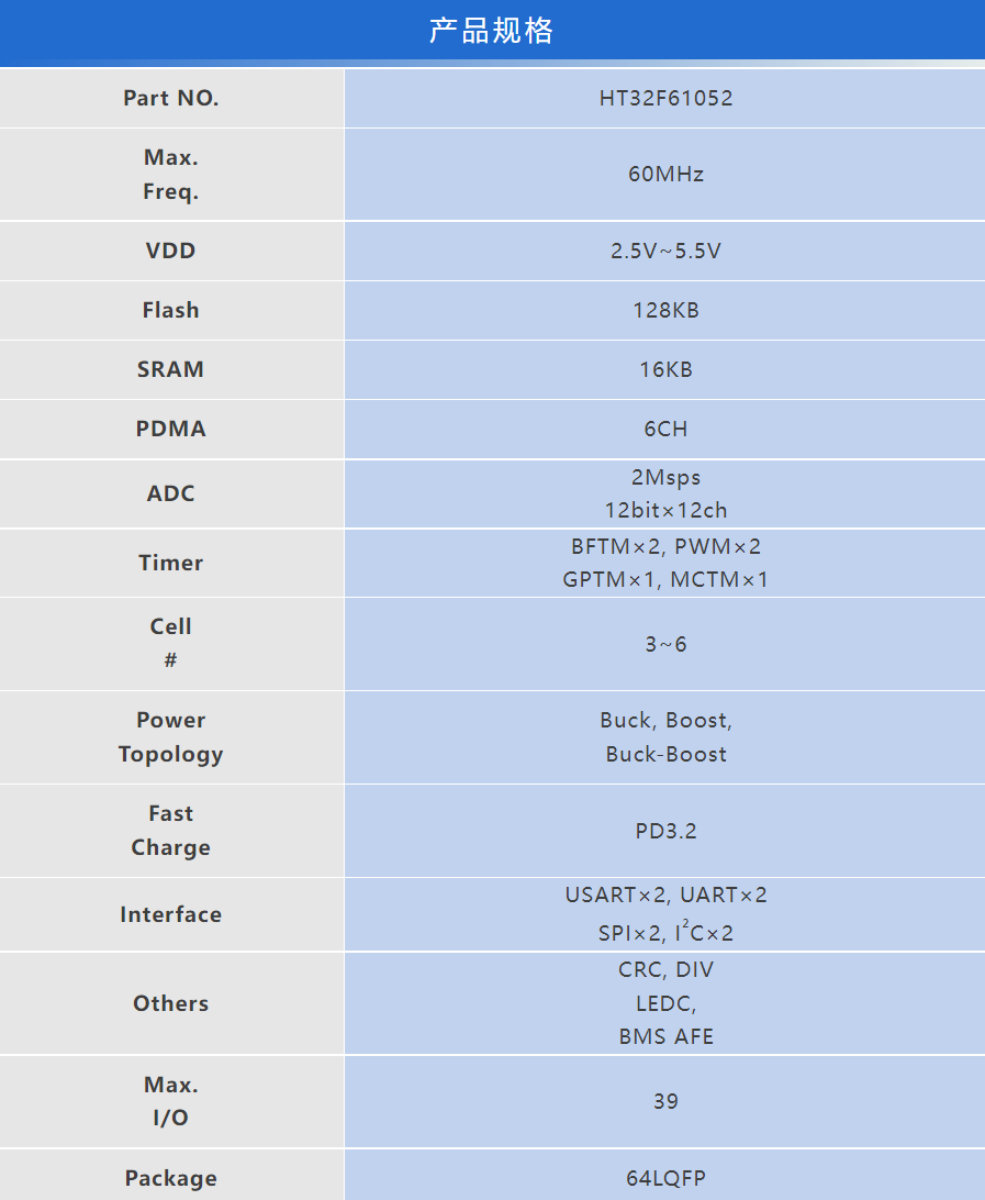 HT32F61052具备128KB Flash,SRAM容量为16KB,最高指令周期可达60MHz,搭载6通道PDMA,在I/O方面具有39个多功能引脚,并提供丰富外设资源,如UART、USART、SPI、I²C等串行传输功能,12个外部通道2Msps 12-bit SAR ADC,两组PMOS型预驱,封装提供64-pin LQFP。