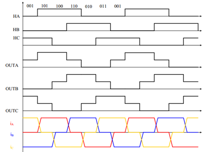 在电机运行的时候,如果检测到0.5s内都没有hall信号变化,判断为堵转故障。发生堵转时,所有低边MOS导通,nFT引脚输出低电平。4.5s后自动重新启动。检测时间和重启时间可以通过LOCK_SEL寄存器配置。