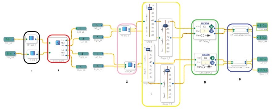 通过使用DSP和SigmaStudio,原始拓扑结构可简化缩小为四个滤波器和四个限幅器。频率平坦度、相位响应、时间对齐和截止区都可用作约束优化中的约束条件。将数字滤波器的有限和无限脉冲响应(FIR和IIR)相结合可扩展更多的优化选项。