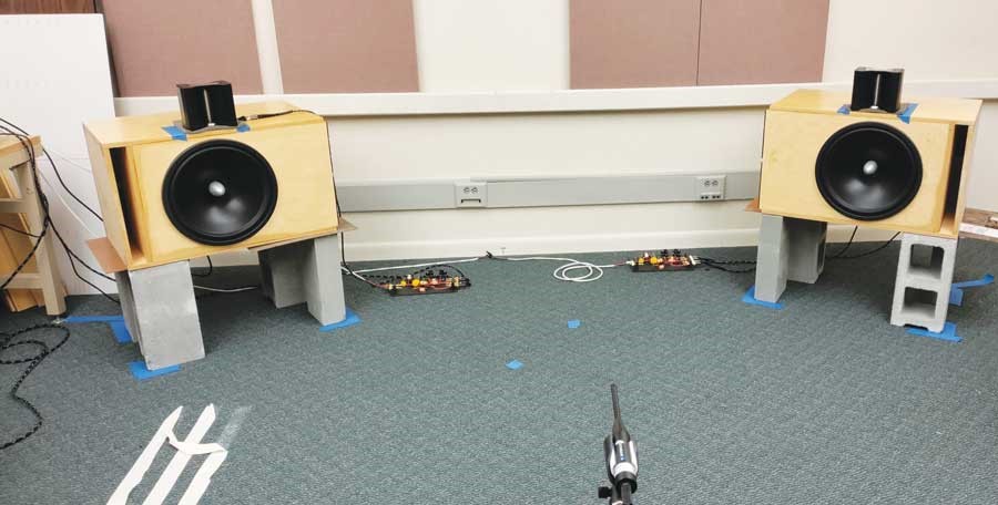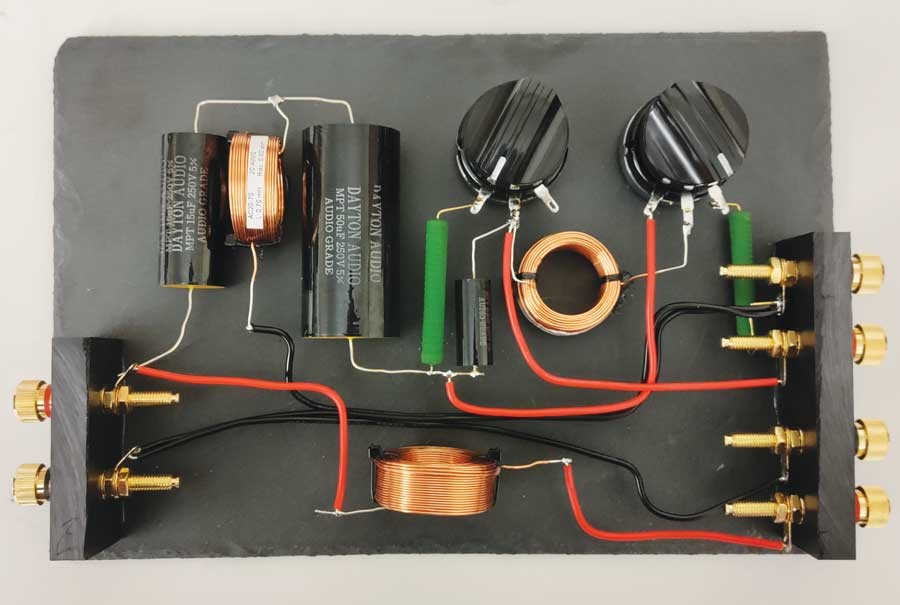 测试设置(图2)使用Acoustic Elegance TD15H-4s作为低音扬声器,并搭配以线性响应、低分频点和宽扩散特性著称的ESS Heil Air Motion Transformer™中高频器件。这些扬声器与高性能无源分频器(图3)相结合,并由Behringer NX1000放大器供电,该放大器在4 Ω时的每通道输出功率可达300 W,THD为0.05%。