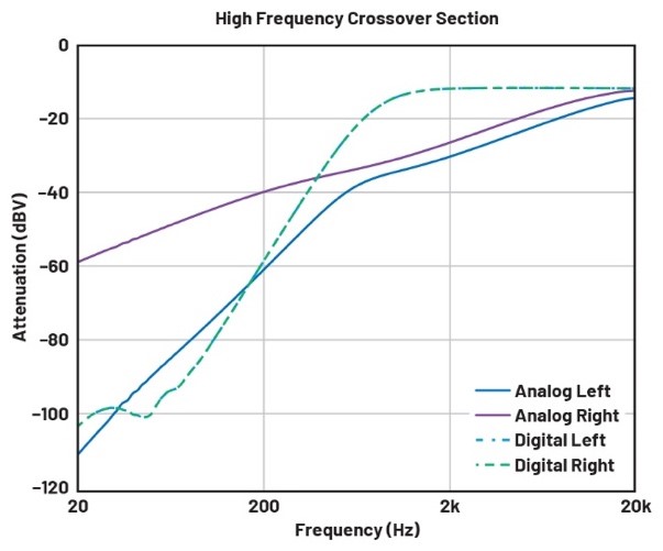 图5.模拟和数字系统分频器网络的响应。请注意,数字左右通道都存在,但在图中完全重叠。