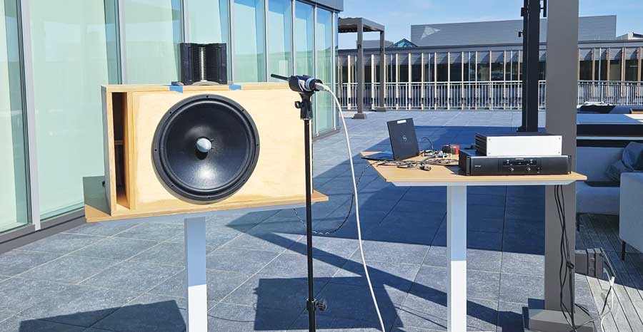 为避免反射干扰,最终测试在开放空间(本例中为实验室的屋顶)进行,以了解扬声器中的自由场响应(图7)。自由场响应是一项重要测试,可验证DSP是否会引起振铃伪影或群延迟。