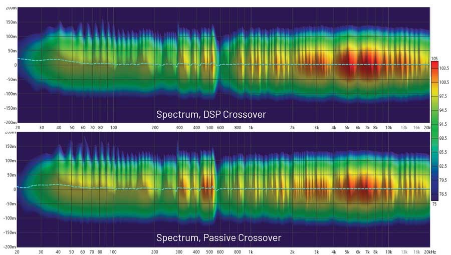 查看模拟和数字系统的频谱图(图8)后发现,数字系统中未出现额外的振铃。这证实了DSP分频器不会给播放带来任何负时域效应。事实上,模拟系统在300 Hz和500 Hz时具有额外谐振。在数字和模拟分频器中,气动高音扬声器(AMT Tweeter)在数字和模拟分频器中的表现较为一致。