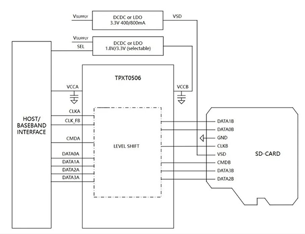 针对SD3.0规范下的高速传输需求,TPXT0506提供了低至数纳秒的传播延迟,并专门设计了时钟反馈通道,以补偿电平转换和PCB走线引入的延迟,为SDR104等超高速模式下的数据读取提供了充足的时序裕量,确保数据传输的稳定与准确。