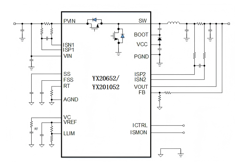 YX20652/YX201052是基于全集成功率MOSFET技术的高性能同步降压转换器。其中,YX20652支持4V至60V的宽输入电压范围,可提供高达10A的输出电流;而YX201052则进一步将输入电压范围拓展至4V–100V,输出电流为5A。两款器件均凭借全集成功率管设计与先进封装工艺,实现了高达97%的转换效率,大幅减少了外围元件数量与PCB布局面积,有助于系统实现更高功率密度与更优整体成本效益。