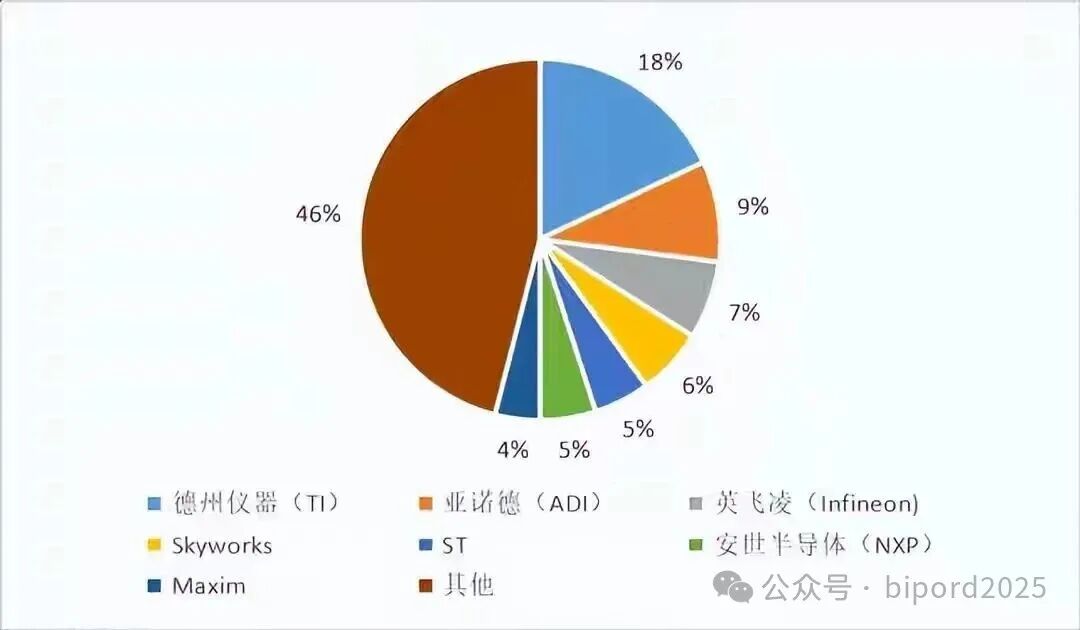 全球市场格局:TI全球电源管理芯片市占率约21%,与高通、ADI、英飞凌等前五大厂商合计占据71%的市场份额。国产厂商整体份额仍较低。