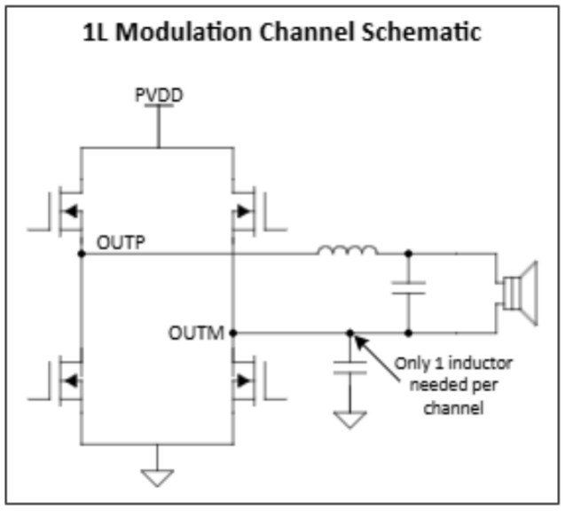 单电感(1L)调制技术是一项专有的汽车级创新技术,可将电感电容(LC)滤波器中的电感数量减少 50%,从而降低成本、节省印制电路板(PCB)空间,并最大限度减轻系统重量。