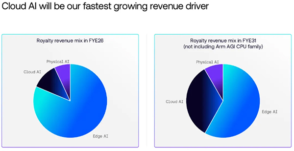 另外Arm的暂时规划下,云才是主要增长点。Arm CEO Rene Hass在接收路透社采访时表示,“推出首款AGI Chip对公司来说是一个非常关键的时刻,这款新芯片将在大约五年内产生约150亿美元的年收入。”