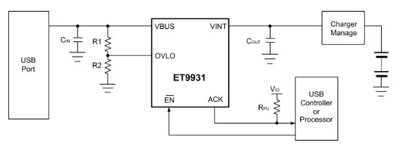 ET9931默认22V的过压保护阈值,可以通过OVLO引脚的外部电阻来调节OVP阈值。该器件在开关启动前有20ms的去抖动时间,然后进行软启动,来限制浪涌电流。内置±100V的浪涌保护,可以有效地防止端口的异常高压。