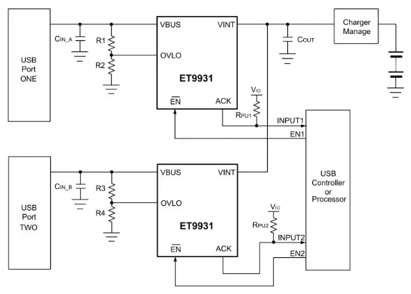 ET9931是一款5.0A的单向的USB PD电源开关,专为高精度电源管理与系统保护设计。ET9931通常用于控制连接到系统USB端口的电源传输,并提供必要的保护功能。它包含欠压锁定、过压锁定、反向电流保护和过温保护等功能,在发生故障时将自动隔离电源开关终端。在关断模式下,VBUS与VINT引脚都具有29V的容差。当设备有2个以上的Type-C端口供电时,两个ET9931可以并联使用,支持双电源连接到同一个充电电路,可防止高压电源端向低压电源端倒灌。